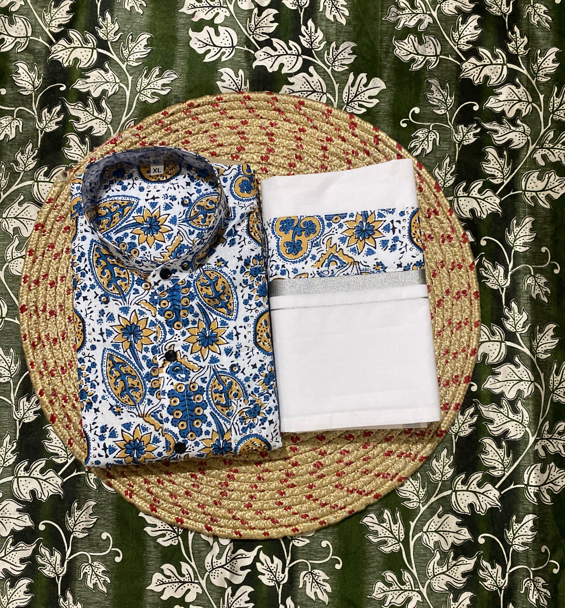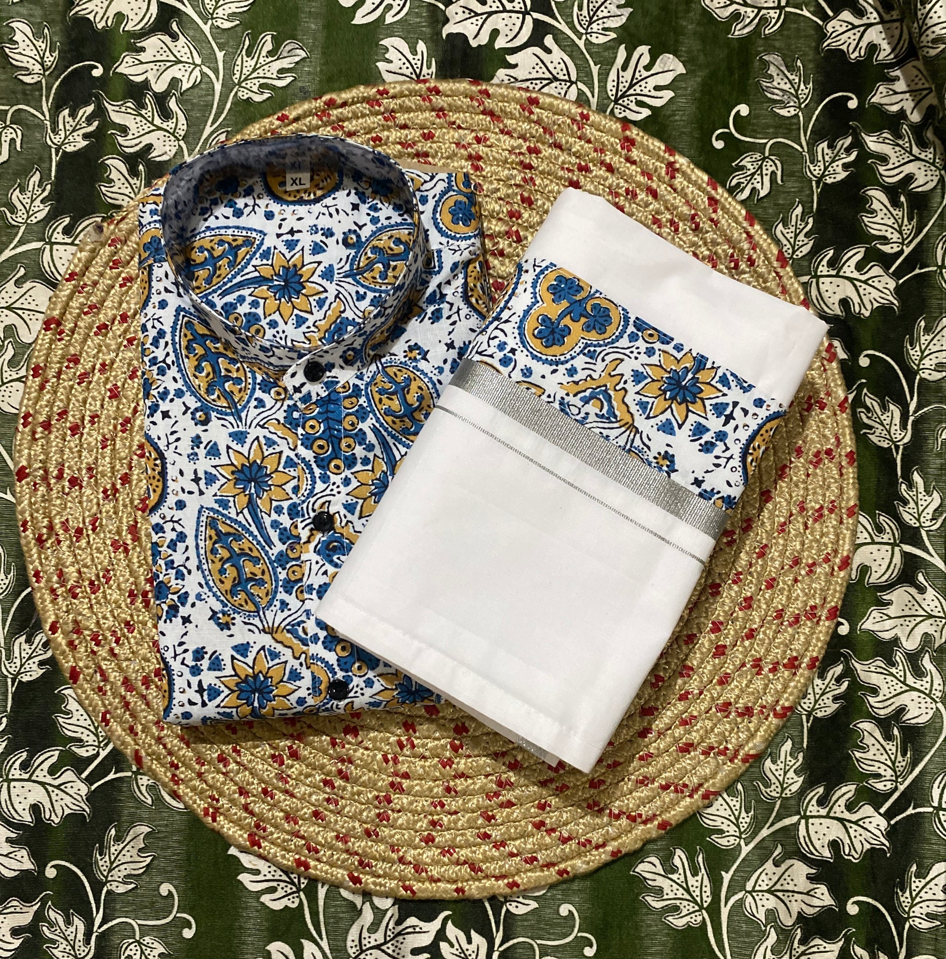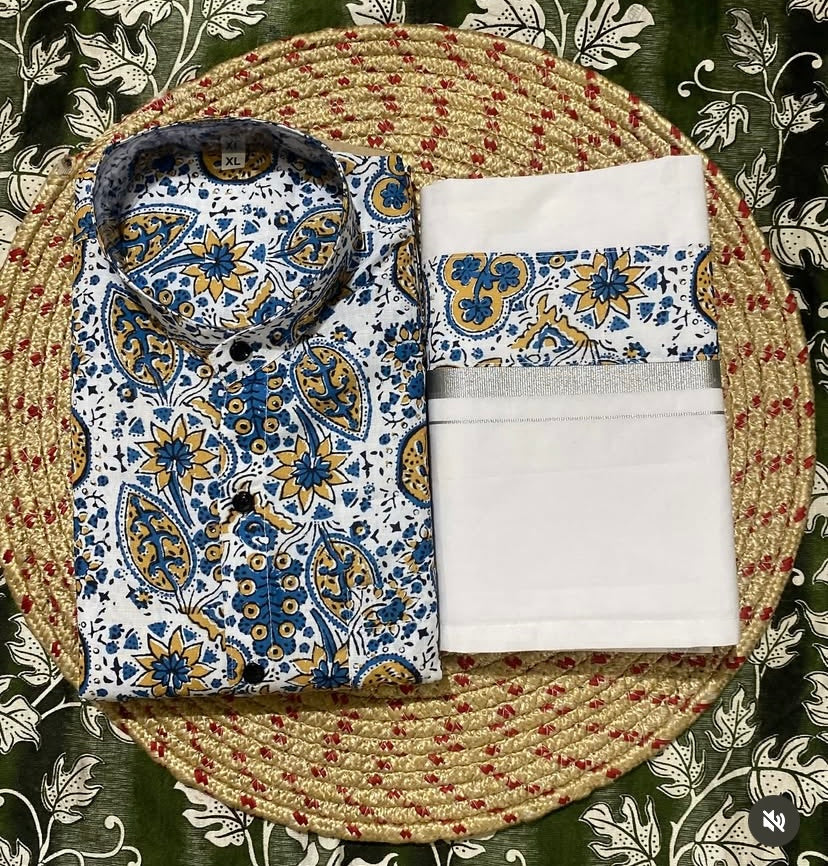 “Step into a world where tradition meets contemporary elegance with this meticulously crafted Dhothi & Shirt set. The Dhothi is made from soft, breathable fabric that drapes effortlessly, providing unmatched comfort while maintaining a timeless appeal. Complementing it is a finely tailored shirt, crafted from premium material—be it crisp cotton, lustrous silk, or smooth satin—designed to offer a perfect fit and subtle sheen. The shirt is enhanced with intricate border detailing along the collar, sleeves, and placket, reflecting careful craftsmanship and attention to every nuance of style. Ideal for festivals, weddings, religious ceremonies, or special occasions, this ensemble balances sophistication and ease, ensuring you look refined while enjoying comfort throughout the day. Its versatile design allows it to be paired with a variety of accessories, making it a wardrobe essential for the modern yet traditional man. Elevate your ethnic wardrobe with this Dhothi & Shirt set that exudes grace, heritage, and understated luxury.”