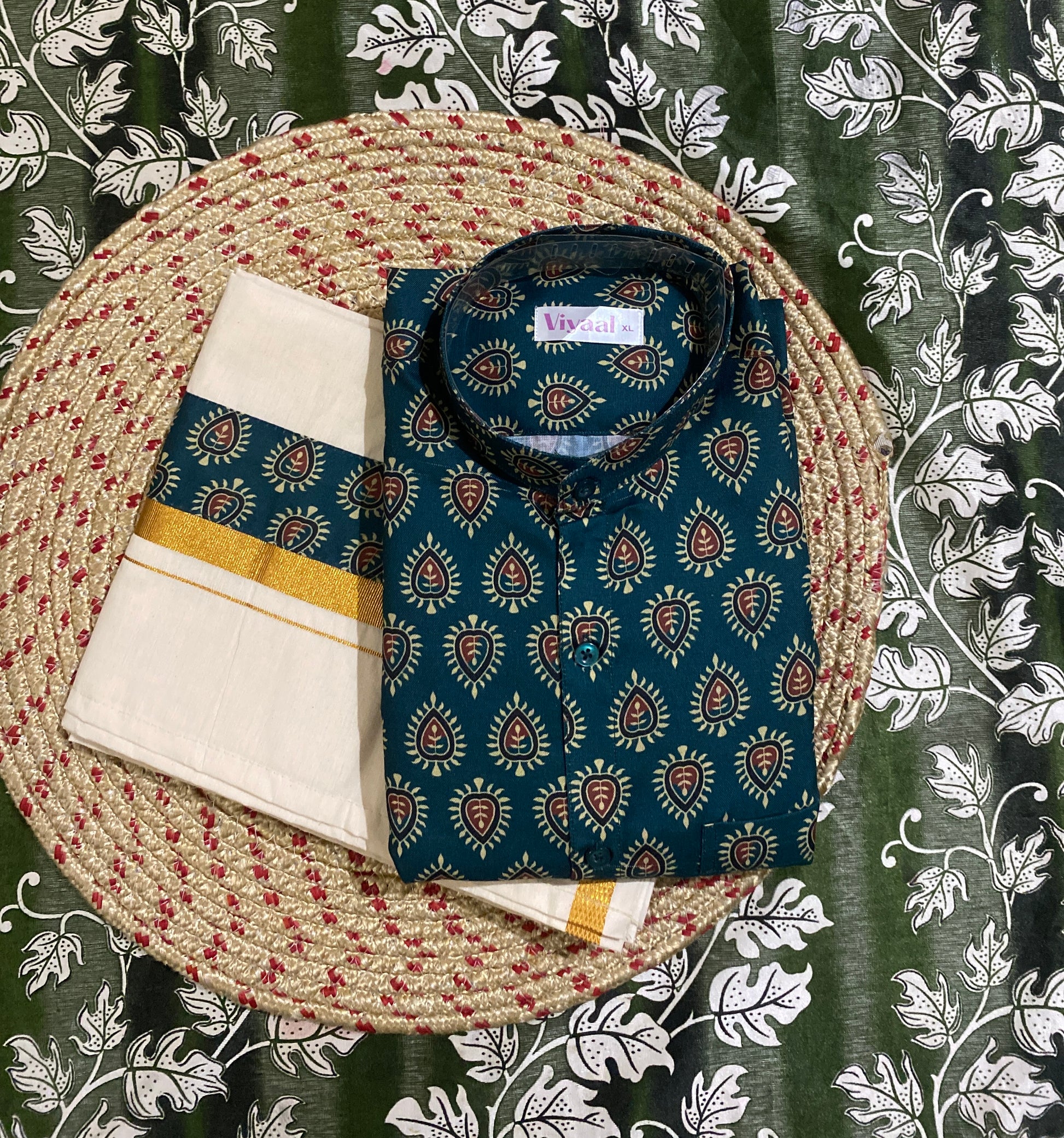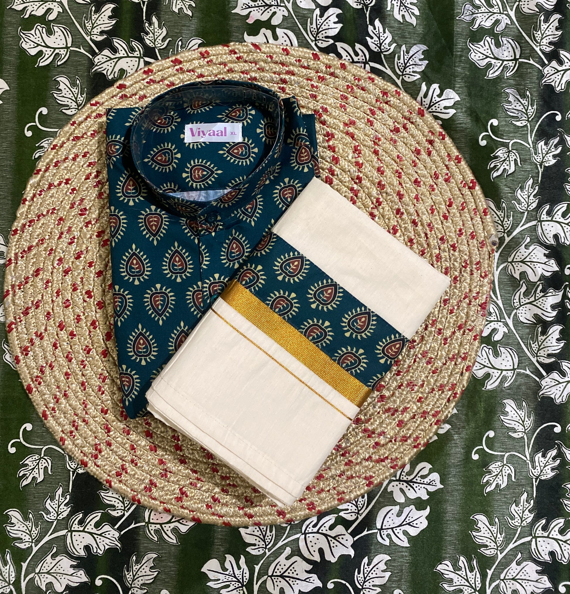“Step into a world where tradition meets contemporary elegance with this meticulously crafted Dhothi & Shirt set. The Dhothi is made from soft, breathable fabric that drapes effortlessly, providing unmatched comfort while maintaining a timeless appeal. Complementing it is a finely tailored shirt, crafted from premium material—be it crisp cotton, lustrous silk, or smooth satin—designed to offer a perfect fit and subtle sheen. The shirt is enhanced with intricate border detailing along the collar, sleeves, and placket, reflecting careful craftsmanship and attention to every nuance of style. Ideal for festivals, weddings, religious ceremonies, or special occasions, this ensemble balances sophistication and ease, ensuring you look refined while enjoying comfort throughout the day. Its versatile design allows it to be paired with a variety of accessories, making it a wardrobe essential for the modern yet traditional man. Elevate your ethnic wardrobe with this Dhothi & Shirt set that exudes grace, heritage, and understated luxury.”