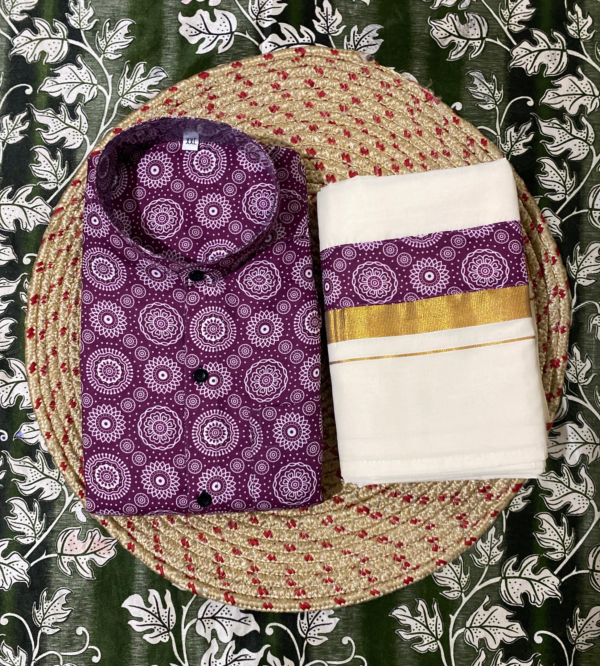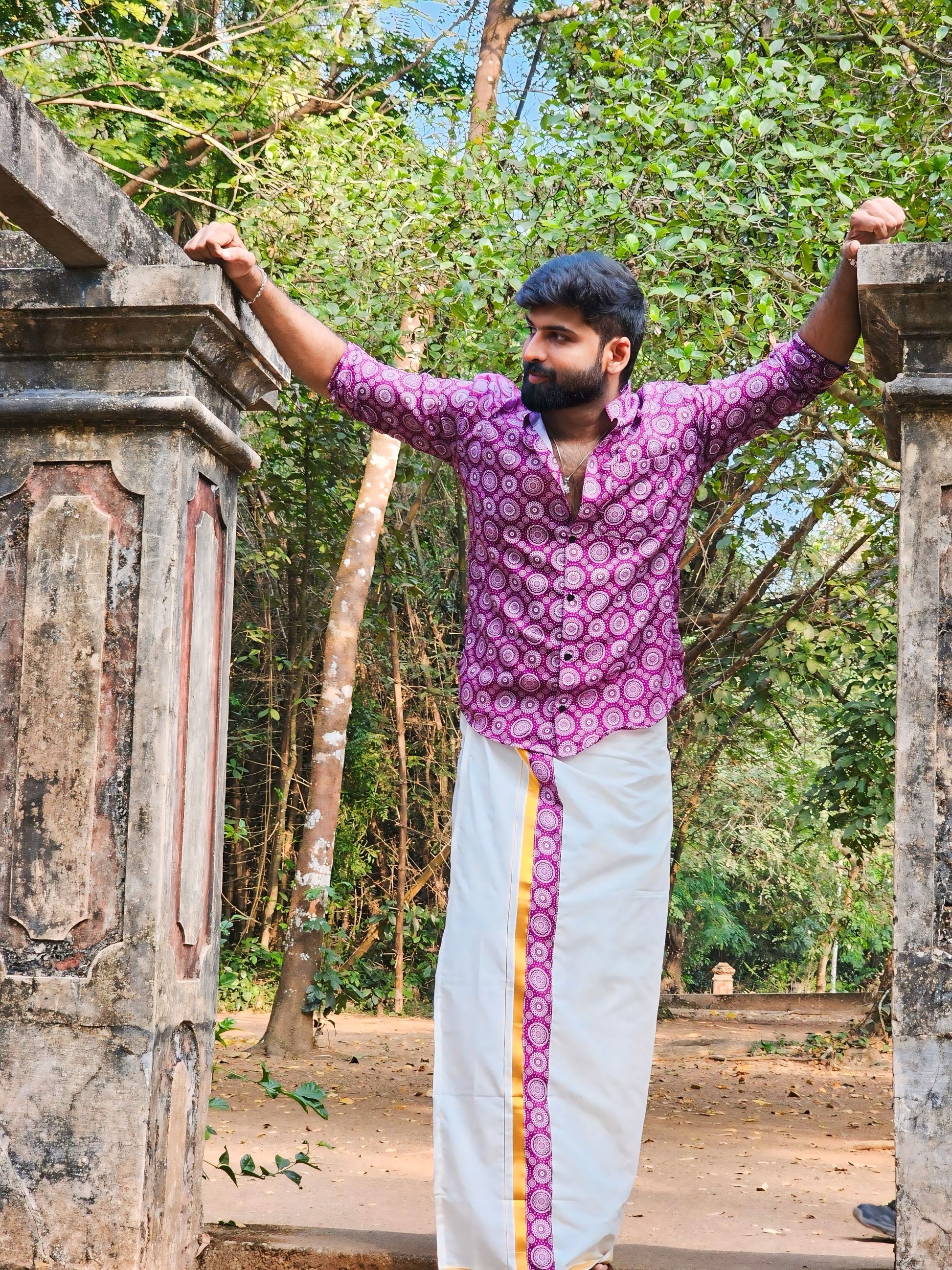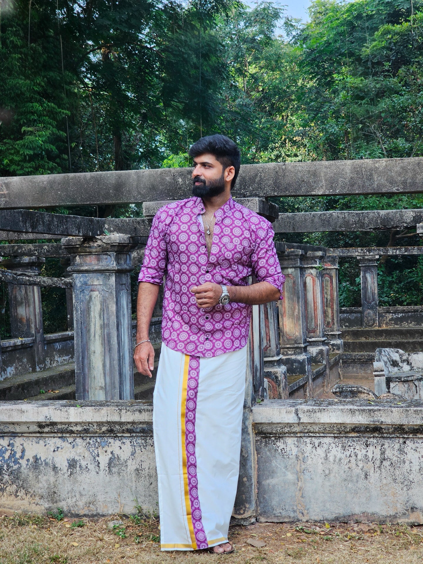 “Step into a world where tradition meets contemporary elegance with this meticulously crafted Dhothi & Shirt set. The Dhothi is made from soft, breathable fabric that drapes effortlessly, providing unmatched comfort while maintaining a timeless appeal. Complementing it is a finely tailored shirt, crafted from premium material—be it crisp cotton, lustrous silk, or smooth satin—designed to offer a perfect fit and subtle sheen. The shirt is enhanced with intricate border detailing along the collar, sleeves, and placket, reflecting careful craftsmanship and attention to every nuance of style. Ideal for festivals, weddings, religious ceremonies, or special occasions, this ensemble balances sophistication and ease, ensuring you look refined while enjoying comfort throughout the day. Its versatile design allows it to be paired with a variety of accessories, making it a wardrobe essential for the modern yet traditional man. Elevate your ethnic wardrobe with this Dhothi & Shirt set that exudes grace, heritage, and understated luxury.”
