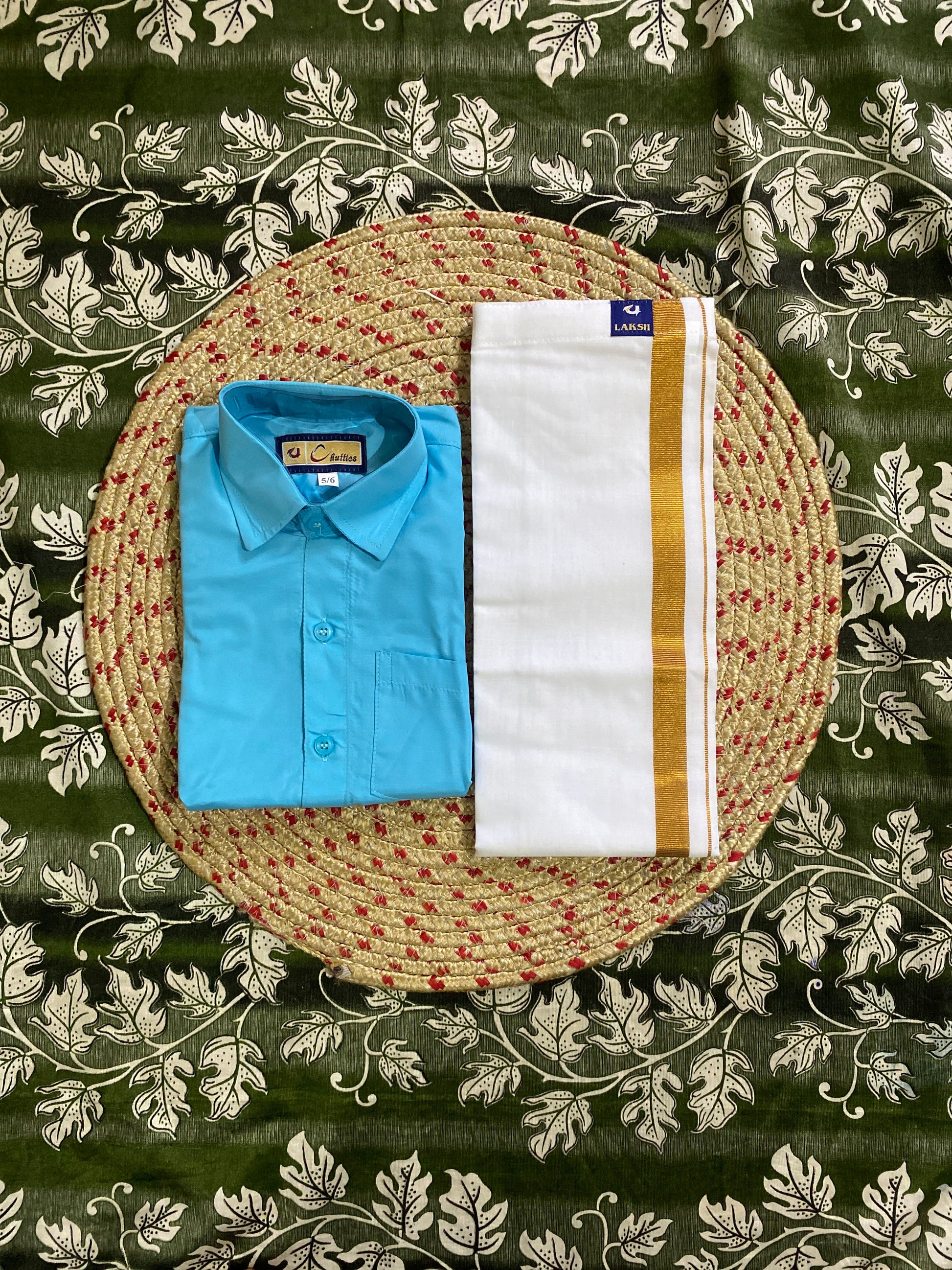 A matching shirt and dhoti is a traditional outfit that people in some parts of India wear on special occasions or celebrations like weddings, festivals, a religious ceremonies. The shirt is usually a colorful patterned top that covers the upper body and has buttons on the front. The dhoti is a long piece of cl that is wrapped around the waist and legs to form loose pants. Both the shirt and dhoti can have similar designs, colors, and patterns to match each other and create a cohesive look. Wearing a matching shirt and dhoti can make you look very stylish and traditional.