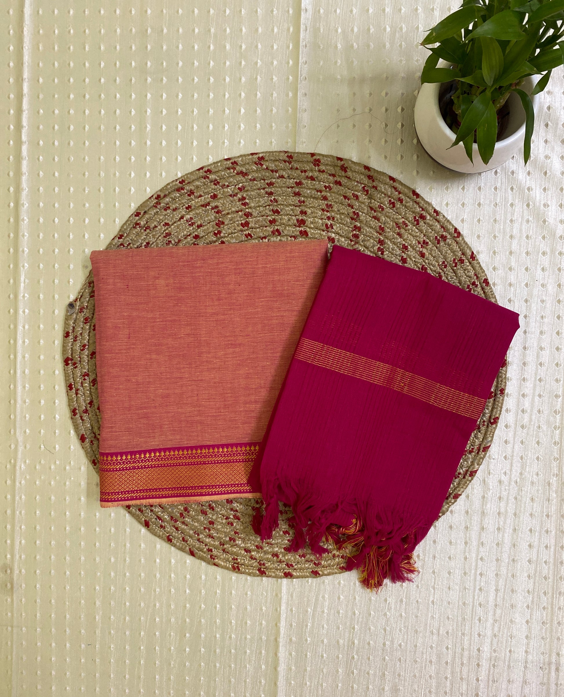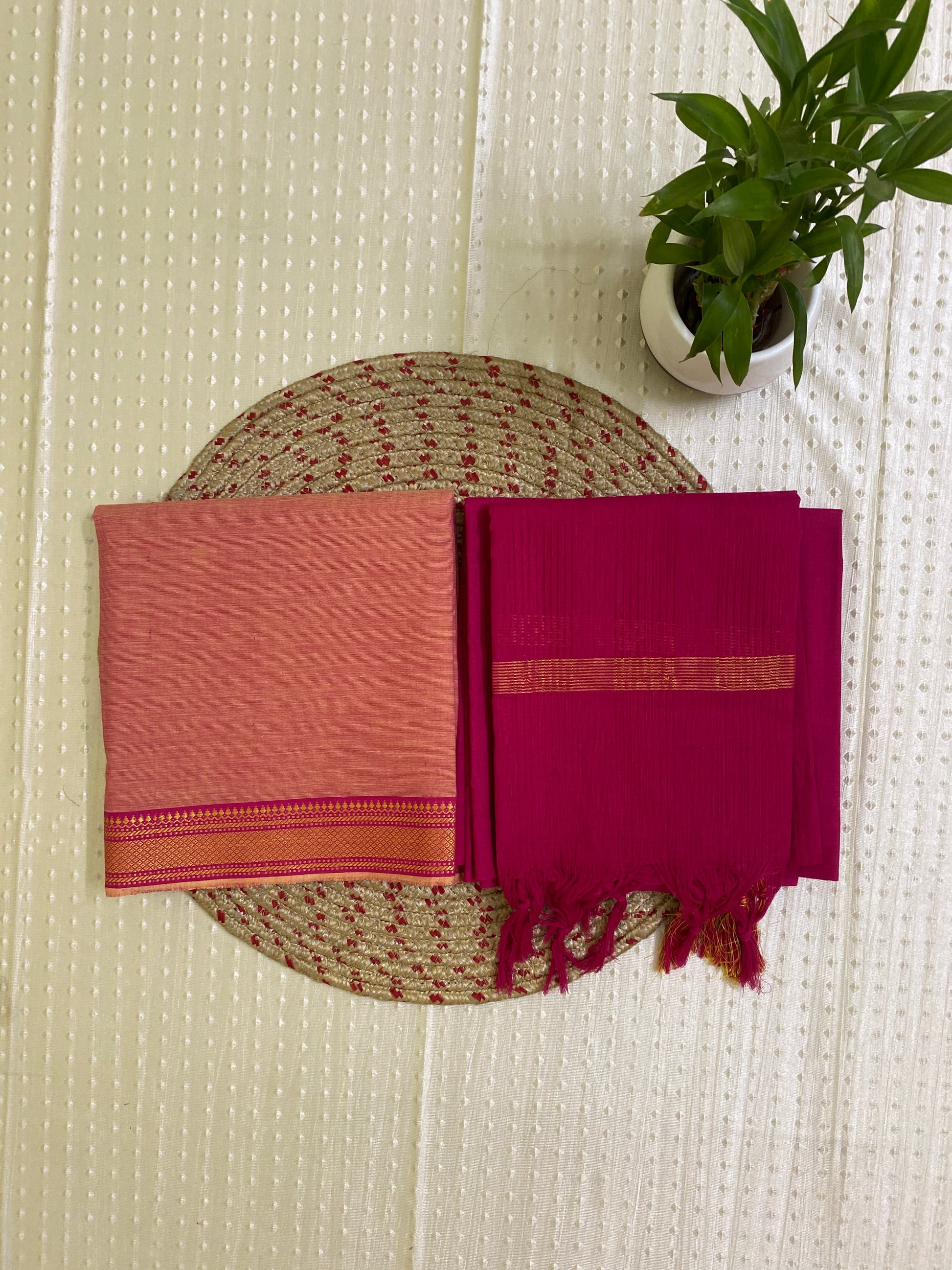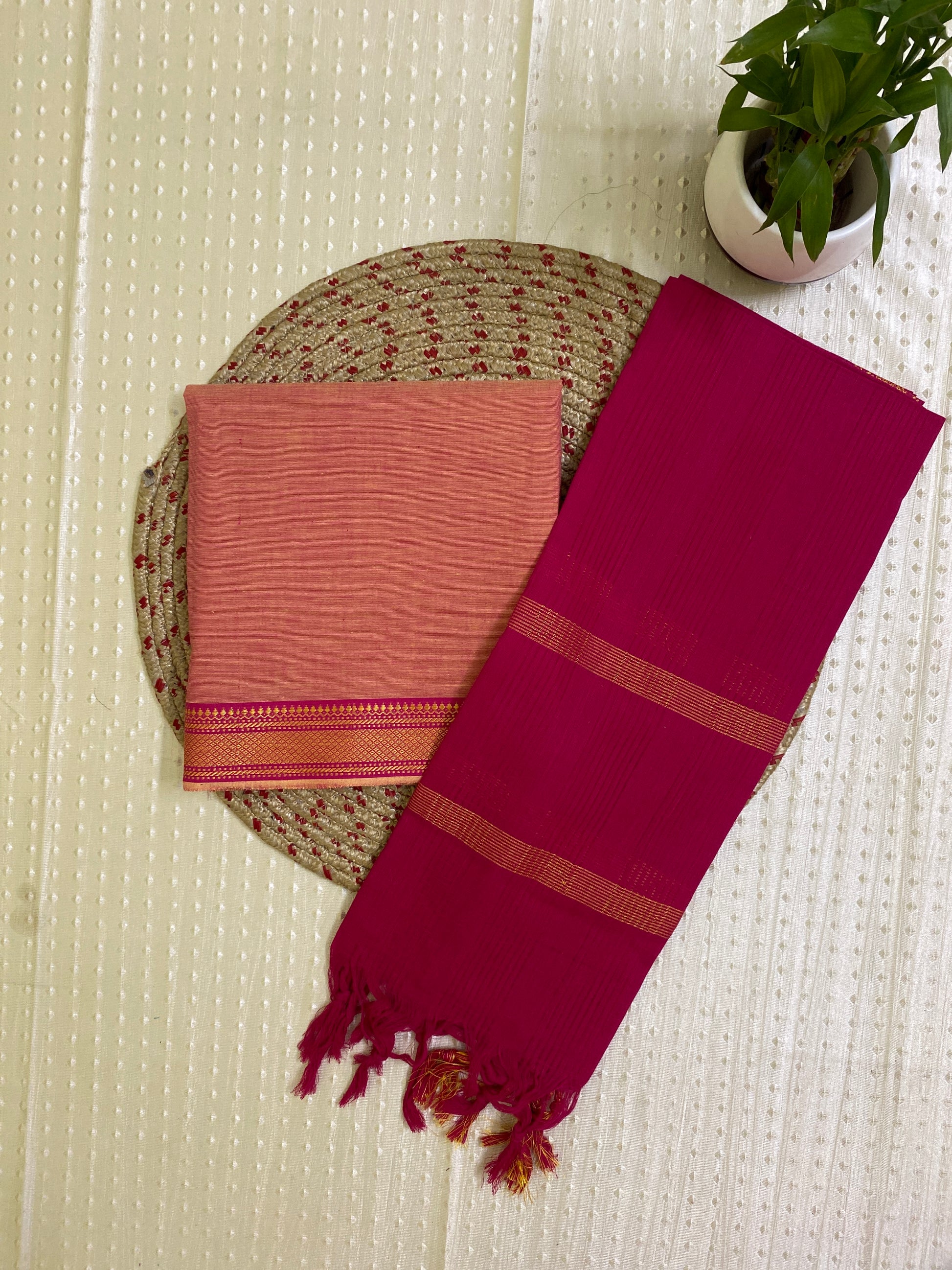 This pure Mangalagiri handloom cotton set is crafted using traditional weaving techniques, giving it a soft, breathable and elegant finish. Each piece is carefully woven by skilled artisans, making it a truly authentic and premium handmade product. The fabric carries natural texture, rich colours, and a timeless handloom charm that suits both daily wear and festive occasions. Designed for comfort and durability, this material lets you style it as per your own fit and fashion preference.
